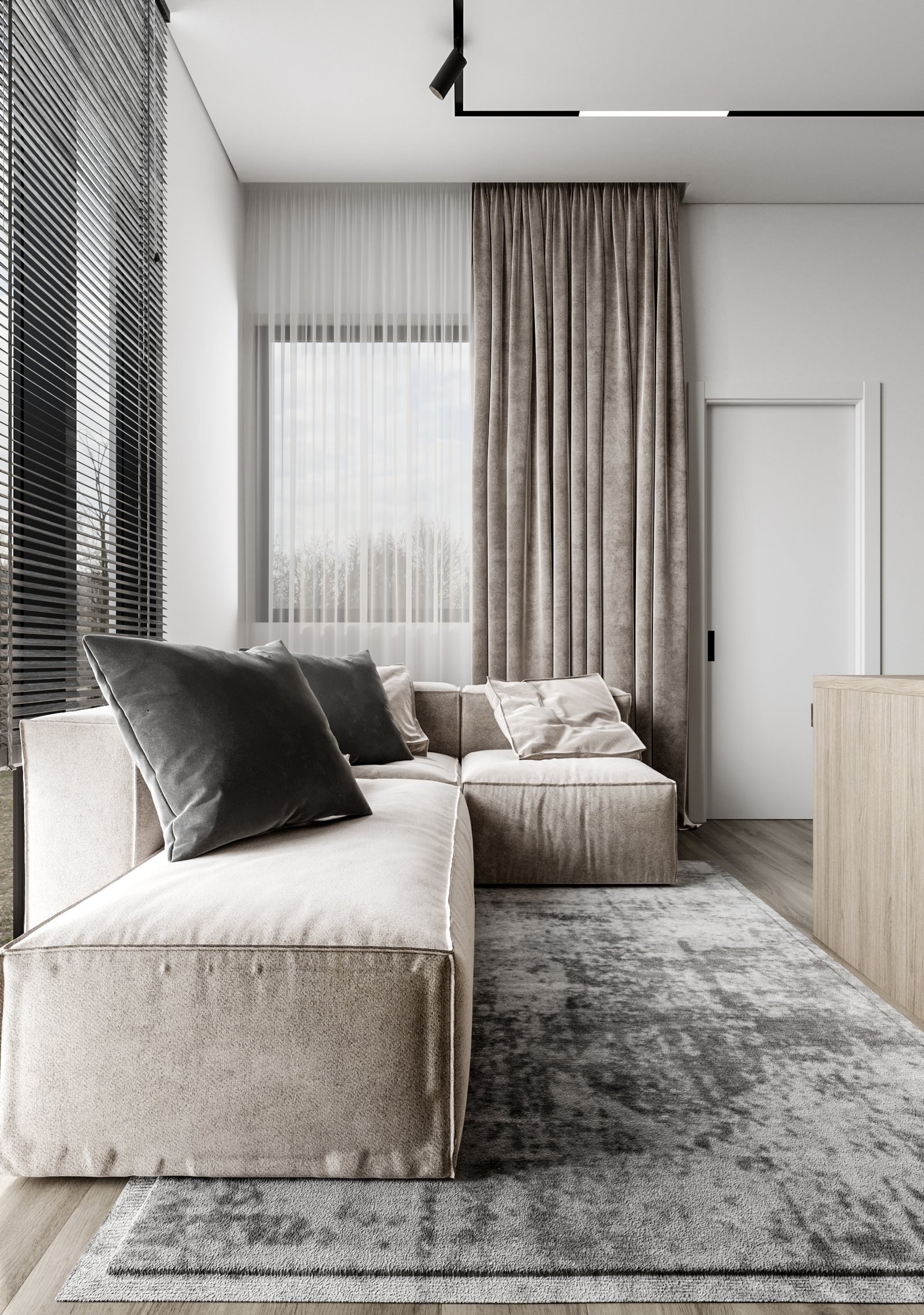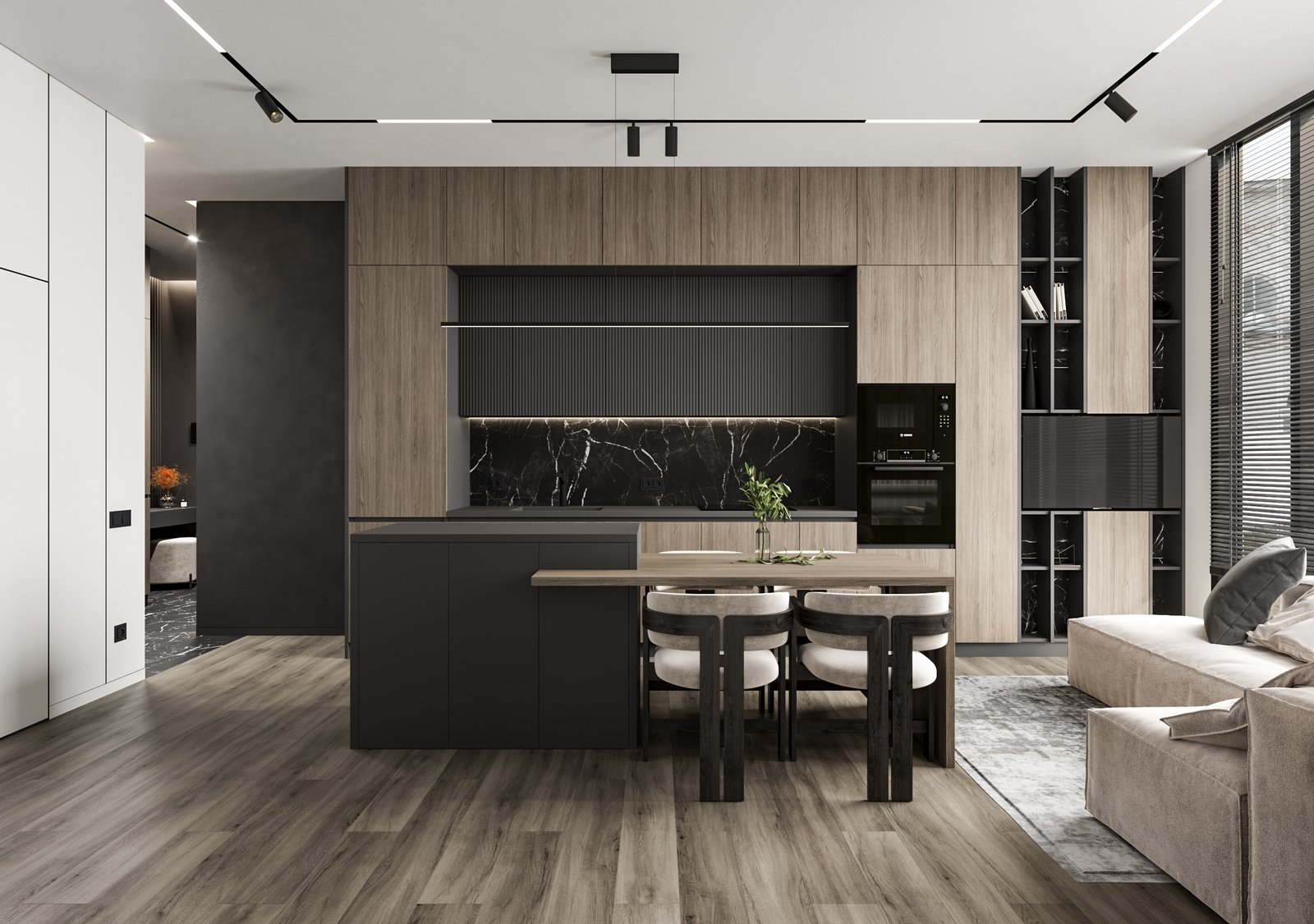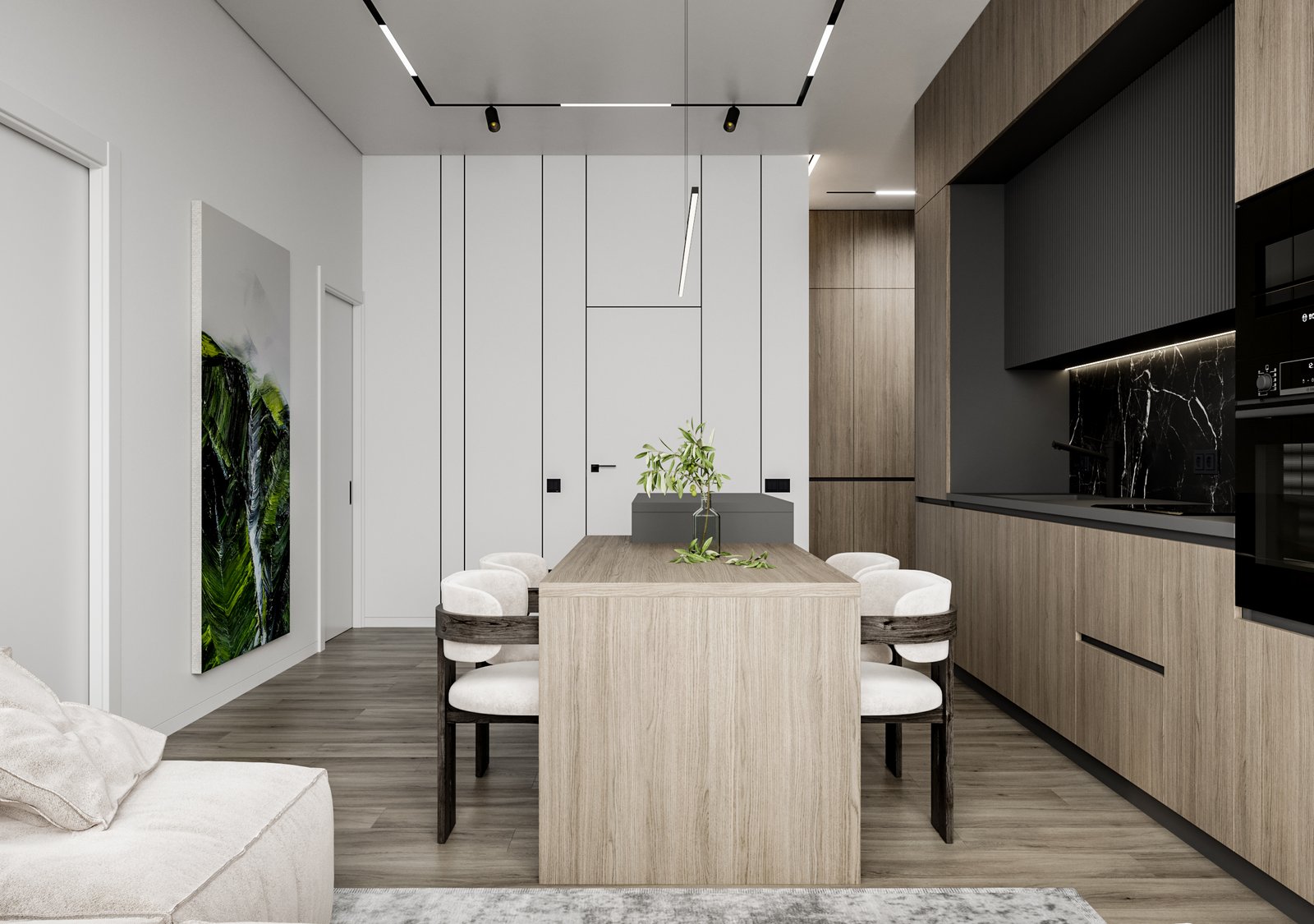 The interior visualizations convey the apartment’s atmosphere, textures, and modern style.