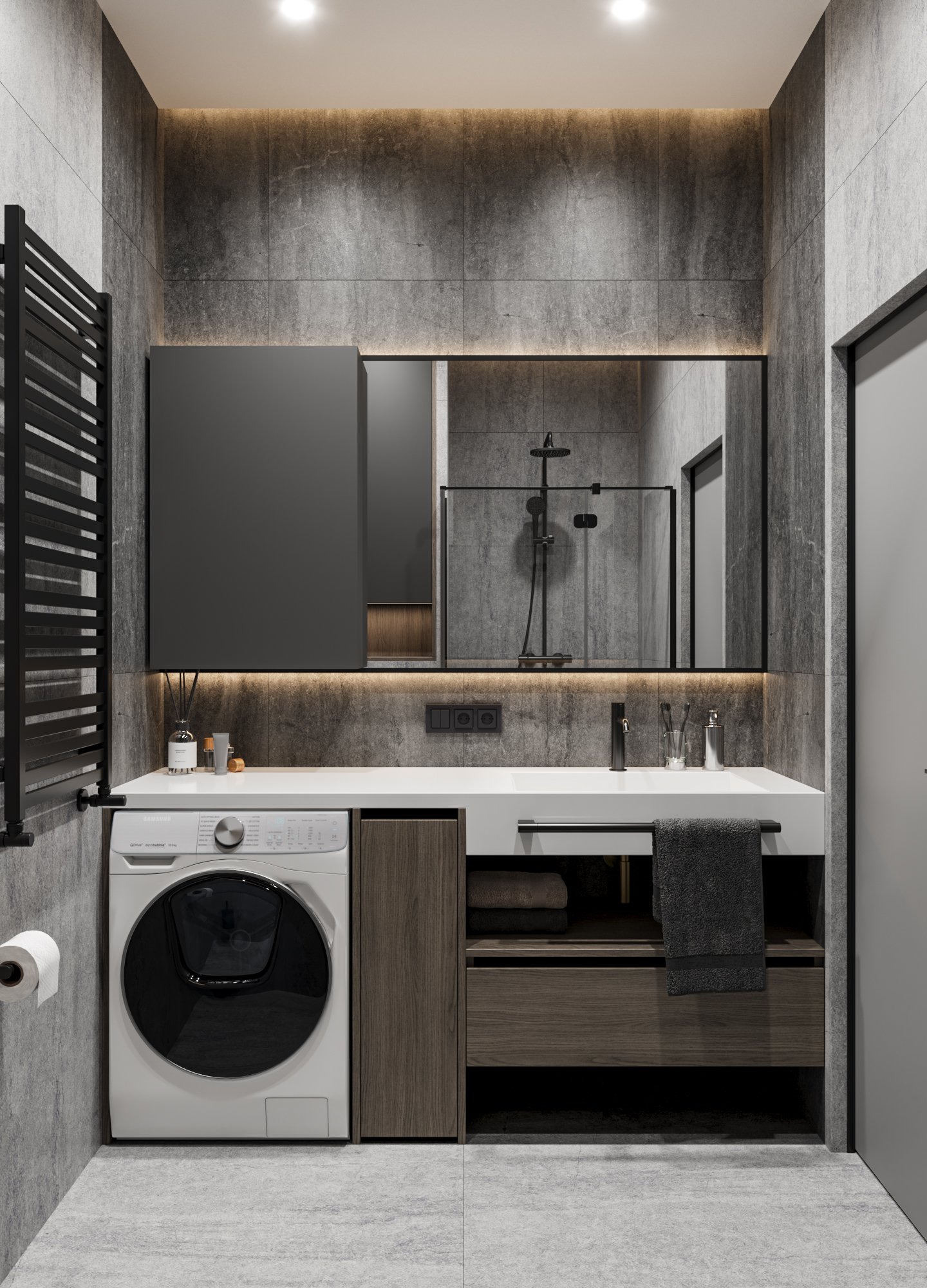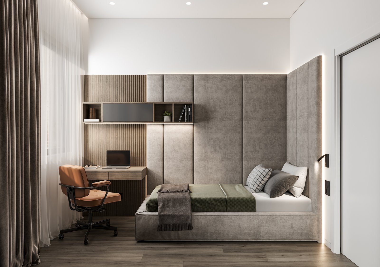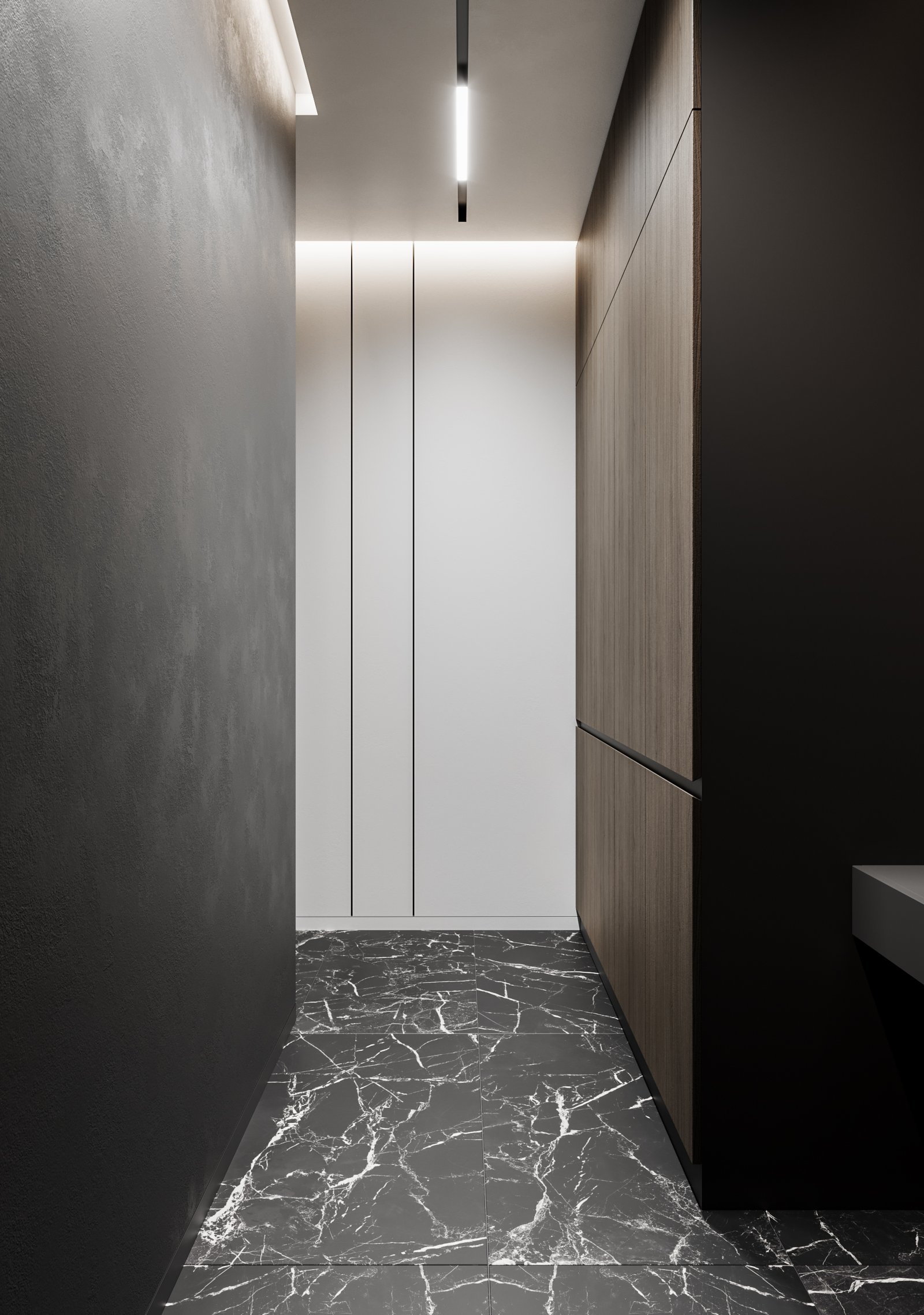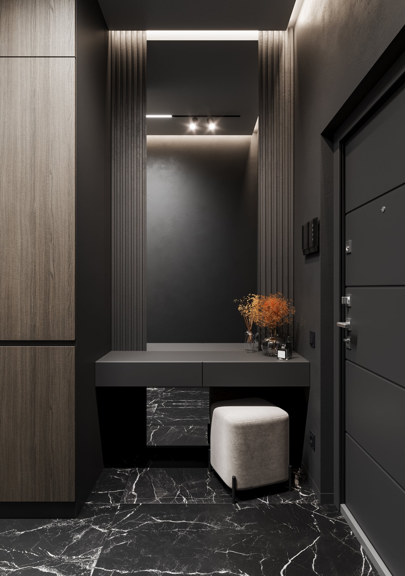 The interior visualizations convey the apartment’s atmosphere, textures, and modern style.