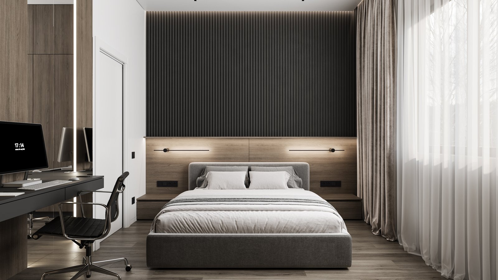 We developed a contemporary-style interior design for a two-room apartment for a male resident, emphasizing a balanced mix of light and dark tones and natural materials such as wood.
