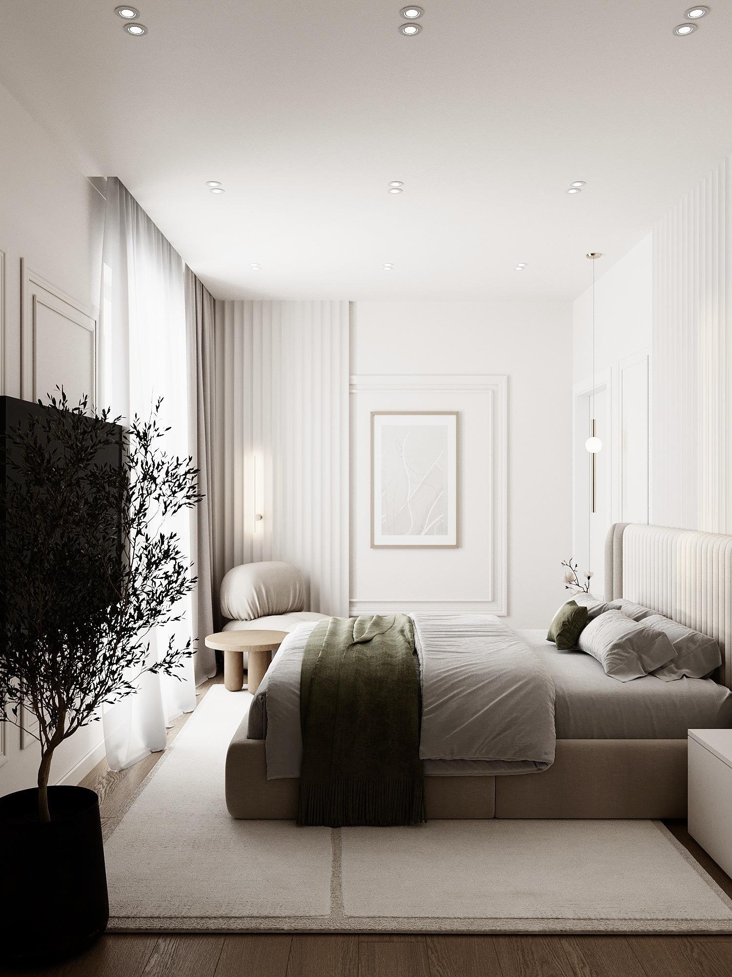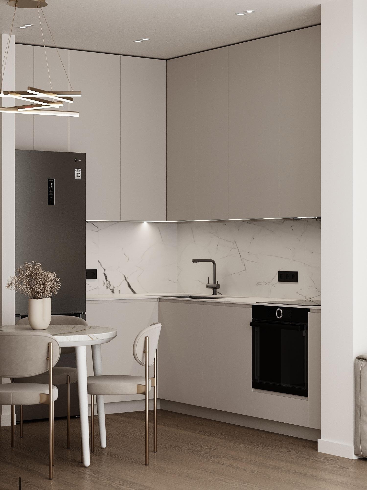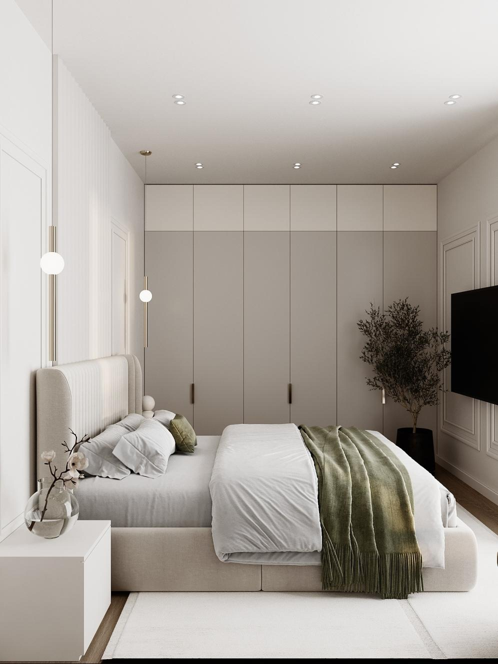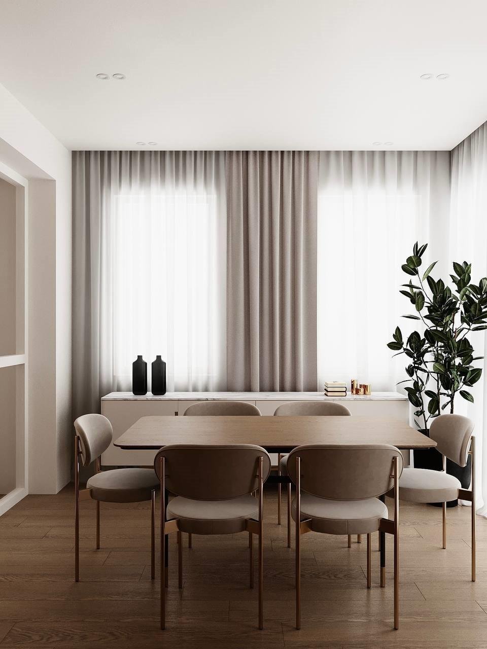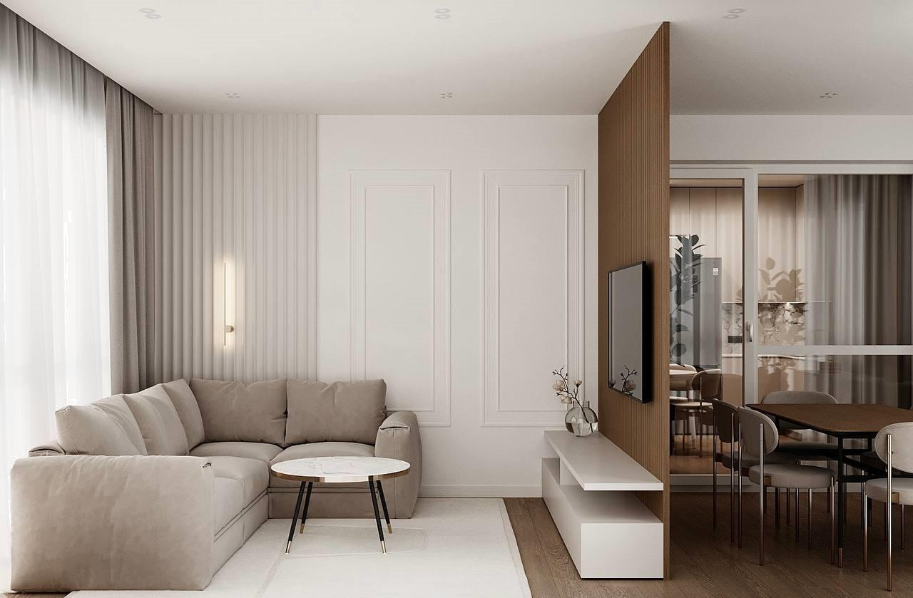 The space is defined by a soft neutral palette, enhancing natural light and emphasizing clarity and openness throughout the apartment.