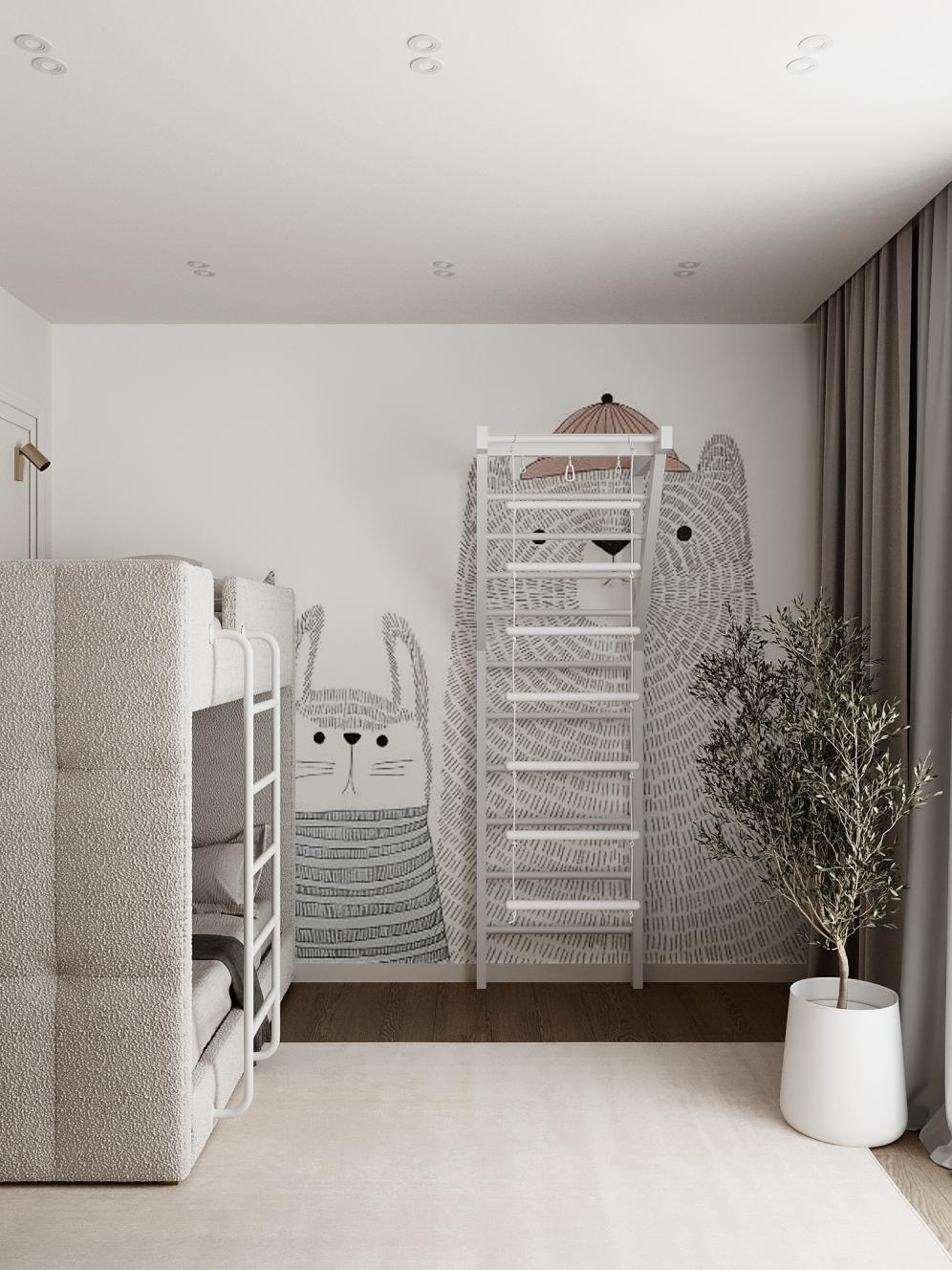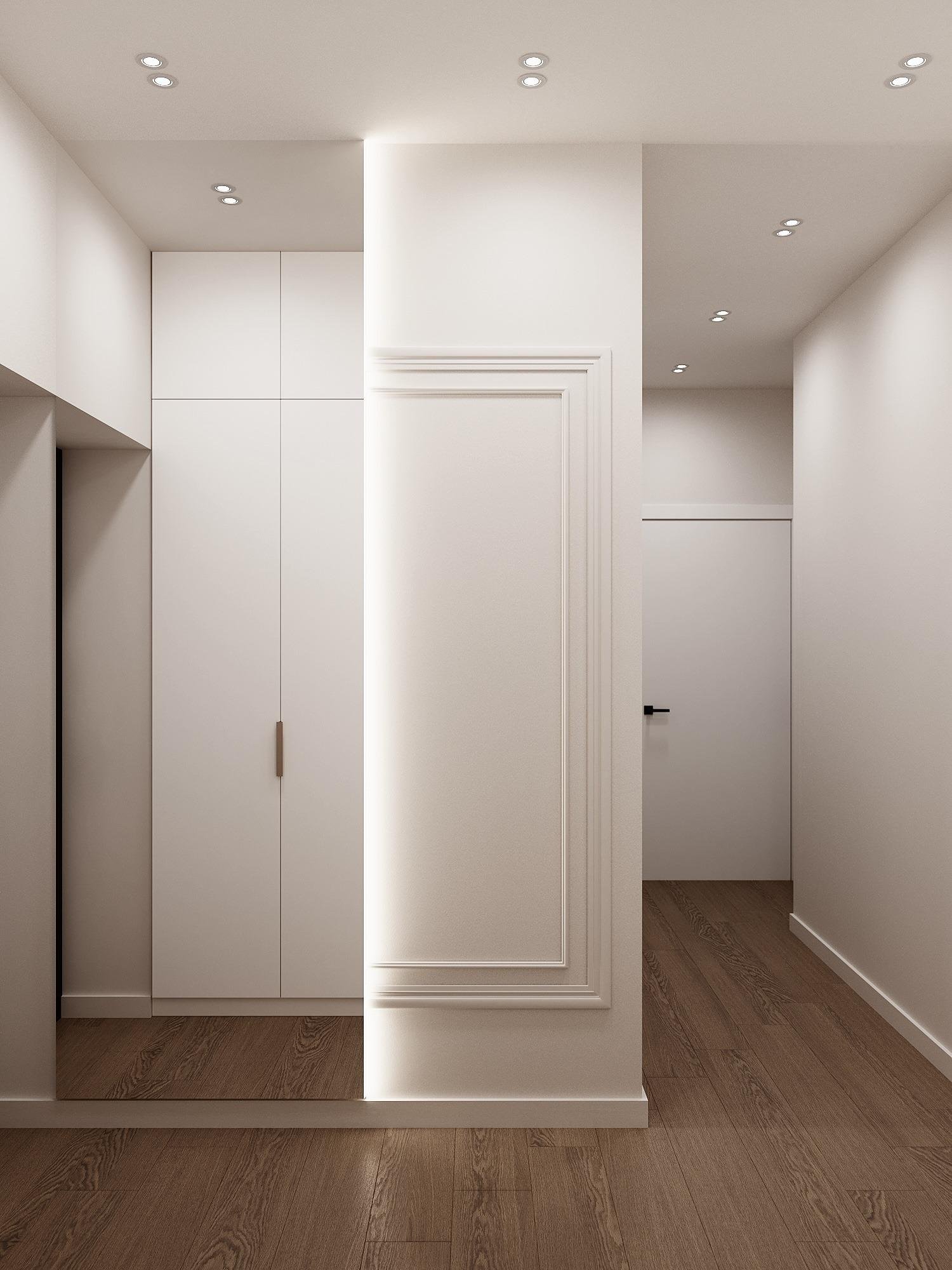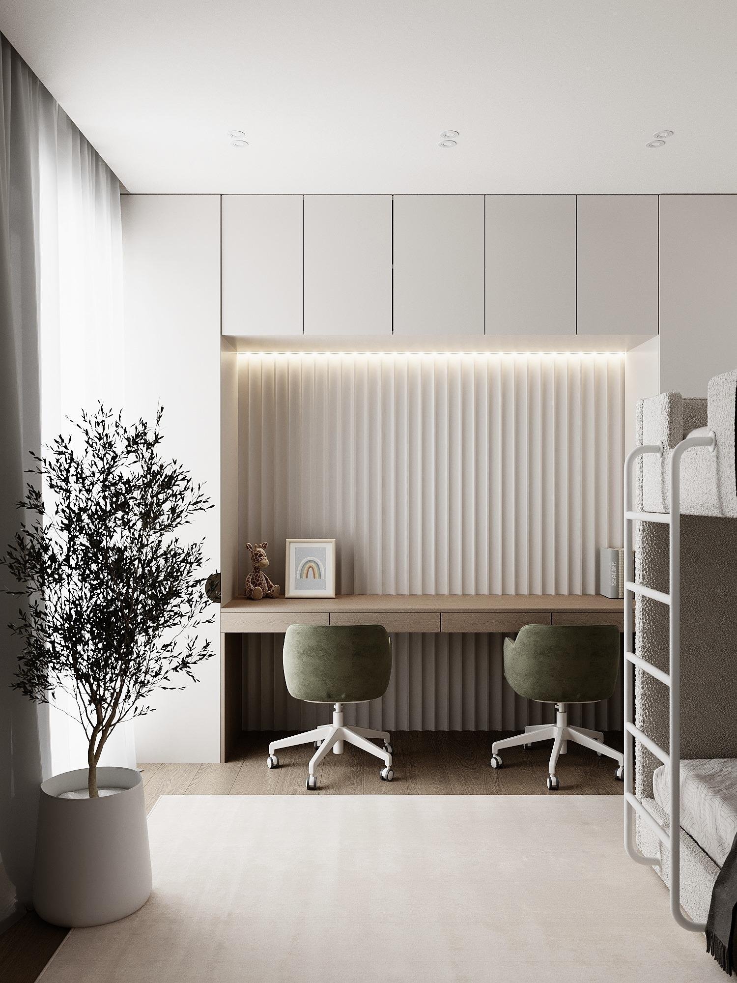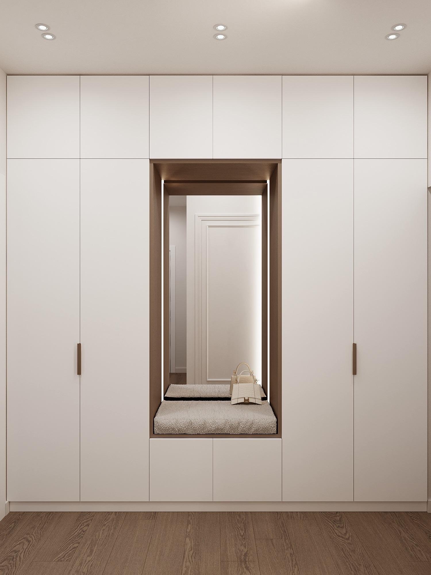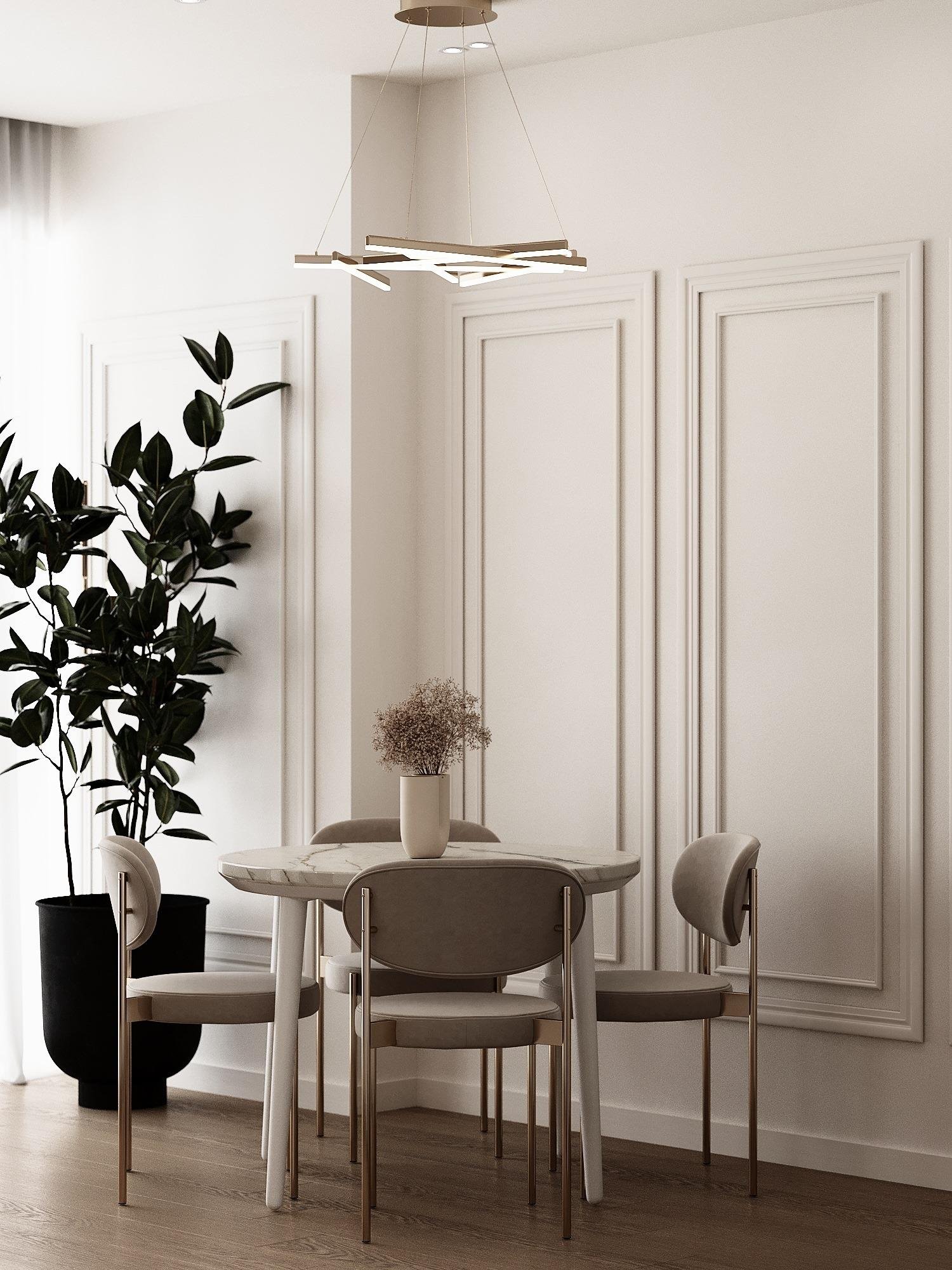 The space is defined by a soft neutral palette, enhancing natural light and emphasizing clarity and openness throughout the apartment.