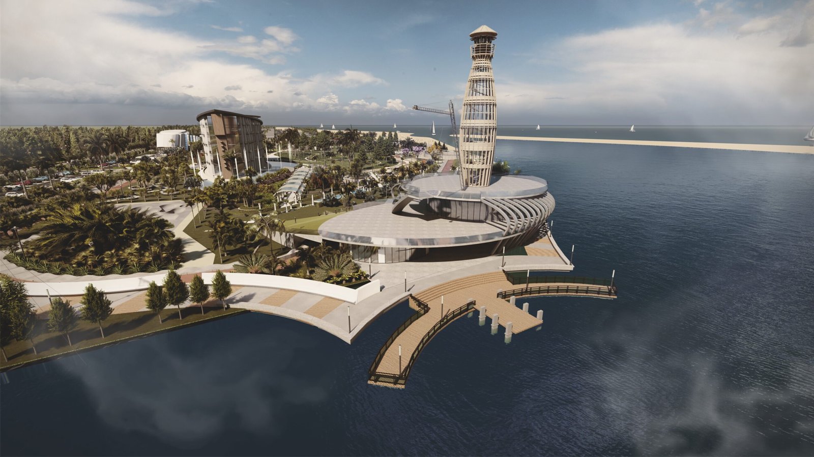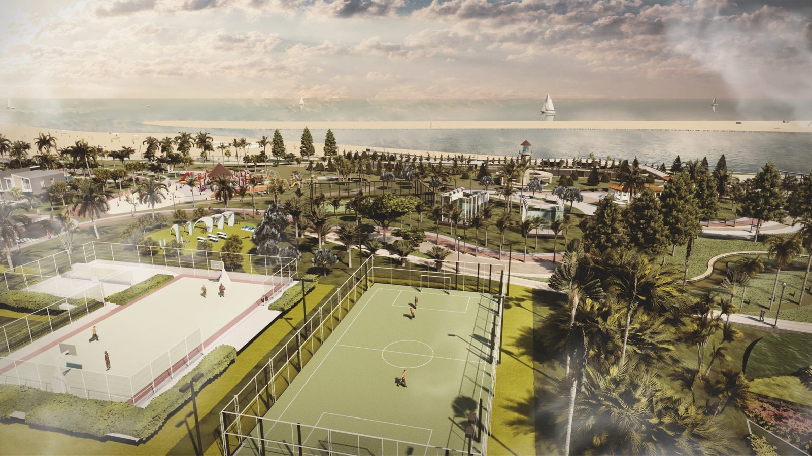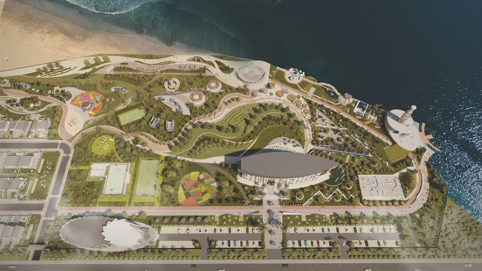 The project integrates coastal landscape qualities with contemporary architectural planning, creating a multifunctional environment for living, recreation, and sport.